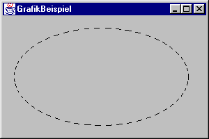 Das folgende Beispiel zeichnet durch wiederholten Aufruf der Methode drawArc eine Ellipse mit einer gestrichelten Umfangslinie. Ein Aufruf zeichnet dabei jeweils 4 Grad der Ellipse und läßt dann eine Lücke von 3 Grad, bevor das nächste Stück gezeichnet wird: