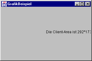 Man kann an diesem Beispiel gut sehen, wie die Größe der Client-Area ermittelt werden kann. Zunächst wird durch Aufruf von getSize die Größe des gesamten Fensters bestimmt. Anschließend werden die Teile des Fensters herausgerechnet, die nicht der Client-Area zur Verfügung stehen, nämlich der Rahmen und die Titelzeile. Auf diese Informationen kann mit Hilfe der Methode getInsets zugegriffen werden. Sie gibt die Abmessungen der Elemente an, die um die Client-Area herum plaziert sind.