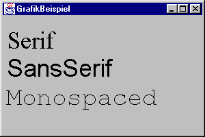 Der Parameter name gibt den Namen des gewünschten Fonts an. In allen Java-Systemen sollten die Namen SansSerif (früher Helvetica), Serif (früher TimesRoman) und Monospaced (früher Courier) unterstützt werden. Sie stehen für die systemspezifischen Proportionalzeichensätze der Familien Helvetica und TimesRoman bzw. für die nichtproportionale Familie Courier. Unter Windows werden diese Standardnamen auf die True-Type-Fonts Arial, Times New Roman und Courier New abgebildet.
