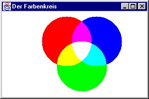 Das Programm arbeitet in der Weise, daß für jeden einzelnen Punkt der Zeichenfläche berechnet wird, ob dieser in einem der drei Kreise liegt. Ist dies der Fall, so wird die zugehörige Farbkomponente auf 255 gesetzt, andernfalls auf 0. Die Bestimmung der Kreiszugehörigkeit erfolgt mit Hilfe des Satzes von Pythagoras, nach dem ein Punkt genau dann zu einem Kreis gehört, wenn die Summe der Quadrate der Abstände vom x- und y-Wert zum Mittelpunkt kleiner gleich dem Quadrat des Radius ist. Die drei Mittelpunkte werden in unserem Beispiel in den Arrays arx und ary, die Radien der Kreise in arr gespeichert. Die boolesche Variable paintit zeigt an, ob der Punkt in wenigstens einem der drei Kreise liegt und daher überhaupt eine Ausgabe erforderlich ist. |