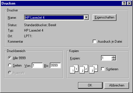 Durch Aufruf von printDialog wird der plattformspezifische Dialog zur Jobkonfiguration aufgerufen (siehe Abbildung 26.3. Er konfiguriert das PrinterJob-Objekt, und die Änderungen können mit den oben beschriebenen Methoden abgefragt werden. Der boolesche Rückgabewert zeigt an, ob der Dialog mit "OK" beendet oder abgebrochen wurde.