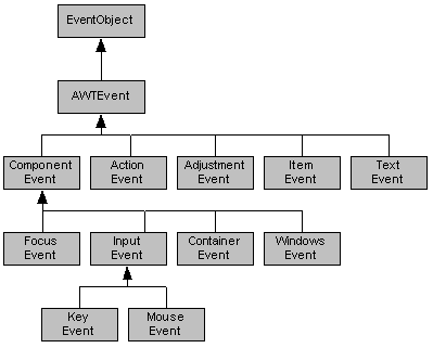 Die Dokumentation zum JDK unterteilt diese Klassen in zwei große Hierarchien. Unterhalb der Klasse ComponentEvent befinden sich alle Low-Level-Ereignisse. Sie sind für den Transfer von elementaren Nachrichten zuständig, die von Fenstern oder Dialogelementen stammen. Die übrigen Klassen ActionEvent, AdjustmentEvent, ItemEvent und TextEvent werden als semantische Ereignisse bezeichnet. Sie sind nicht an ein bestimmtes GUI-Element gebunden, sondern übermitteln höherwertige Ereignisse wie das Ausführen eines Kommandos oder die Änderung eines Zustands.