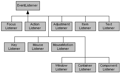 Damit ein Objekt Nachrichten empfangen kann, muß es eine Reihe von Methoden implementieren, die von der Nachrichtenquelle, bei der es sich registriert hat, aufgerufen werden können. Um sicherzustellen, daß diese Methoden vorhanden sind, müssen die Ereignisempfänger bestimmte Interfaces implementieren, die aus der Klasse EventListener des Pakets java.util abgeleitet sind. Diese EventListener-Interfaces befinden sich im Paket java.awt.event.