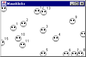 Leider hat das Beispielprogramm eine gravierende konzeptionelle Schwäche, denn die gezeichneten Smileys sind nicht dauerhaft. Wird das Fenster in den Hintergrund gestellt, nachdem einige Mausklicks durchgeführt wurden, sind bei erneuter Anzeige des Fensters die zuvor gezeichneten Smileys wieder verschwunden. Der Grund dafür ist, daß wir in unserem Beispiel nicht die paint-Methode überlagert haben, sondern die Ausgaben als direkte Reaktion auf ein Mausereignis erledigten. Da Windows nicht dafür sorgt, den Inhalt eines zuvor verdeckten Fensters zu rekonstruieren, ist die Anwendung selbst dafür verantwortlich, dies in ihrer paint-Methode zu tun. Eine bessere Implementierung dieses Programms würde also darin bestehen, die Koordinaten und Eigenschaften aller gezeichneten Objekte zu speichern und sie beim Aufruf von paint später selbst zu rekonstruieren. Wir werden diese Vorgehensweise in einem späteren Beispiel genauer kennenlernen.