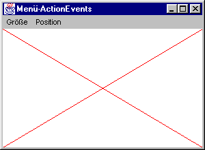 Die Unterscheidung der verschiedenen Ereignisquellen wird innerhalb von actionPerformed durch Aufruf von getActionCommand erledigt. Deren Rückgabewert wird abgefragt, um das passende Kommando auszuführen. Die Größenänderung erfolgt durch Aufruf von getSize und setSize, die Positionierung mit getLocation und setLocation. Zur Kontrolle zeichnet das Programm in paint zwei rote Diagonalen über die volle Länge der Client-Area: