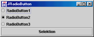 Die Klasse JRadioButton ähnelt der Klasse JCheckBox. Auch sie stellt einen Button dar, der wahlweise an- oder ausgeschaltet werden kann. Anders als bei JCheckBox ist in einer Gruppe von Radiobuttons allerdings immer nur ein Button zur Zeit aktiviert, alle anderen sind deaktiviert. Die wichtigsten Konstruktoren von JRadioButton sind:
