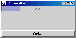 Das folgende Programm zeigt eine einfache Anwendung von JProgressBar. Es enthält eine Fortschrittsanzeige mit einem Wertebereich von 0 bis 100 und einem initialen Wert von 0. Durch Betätigen des Buttons "Weiter" wird der Wert um fünf erhöht. Hat der Wert hundert erreicht, wird er wieder auf null gesetzt.