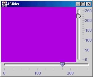 Das Programm erzeugt einen horizontalen und vertikalen Slider, dessen Wertebereich jeweils von 0 bis 255 reicht. Beide werden mit Skalenmarken und Beschriftungen versehen, der horizontale Slider rastet auf den Skalenmarkierungen ein. Bei jeder Änderung wird stateChanged aufgerufen und der aktuelle Sliderwert einer der beiden Farbvariablen zugewiesen. Anschließend wird der Hintergrund des farbigen Panels verändert und gegebenenfalls der Farbwert auf der Konsole ausgegeben.