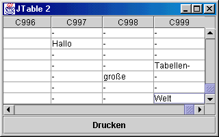 Wie in anderen großen Dialogelementen haben wir die JTable vor der Übergabe an ihren GUI-Container in eine JScrollPane verpackt. Neben dem Effekt, die Daten vertikal oder horizontal scrollen zu können, hat das vor allem zur Folge, daß die Spaltenköpfe angezeigt werden. Ohne JScrollPane wären sie dagegen nicht sichtbar. |