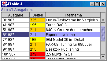 Der Renderer erzeugt bei jedem Aufruf von getTableCellRendererComponent eine neue Instanz der Klasse JLabel. Da das während der Arbeit mit der Tabelle sehr häufig erfolgt (schon das Bewegen des Mauszeigers über der Tabelle löst etliche Aufrufe aus), ist diese Vorgehensweise recht ineffizient und belastet den Garbage Collector. In "echten" Programmen sollte daher mehr Aufwand getrieben werden. So könnten beispielsweise Renderer in einem Cache zwischengespeichert und bei erneutem Bedarf wiederverwendet werden. Oder das Programm könnte eine Technik ähnlich der von DefaultTableCellRenderer verwenden und nur eine einzige Instanz erzeugen. Die Lektüre des Quelltextes der Klasse zeigt, wie es gemacht wird. |