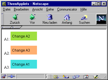 Wir wollen nun eine HTML-Seite anlegen, die drei Instanzen von ChgNextApplet erzeugt. Sie sollen die Namen "A1", "A2" und "A3" erhalten und sich gegenseitig als NEXT-Applet registrieren. Ein Mausklick auf "A1" ändert die Farbe von "A2", ein Klick auf "A2" die von "A3" und ein Klick auf "A3" die von "A1". Dazu kann folgende Datei ThreeApplets.html verwendet werden: