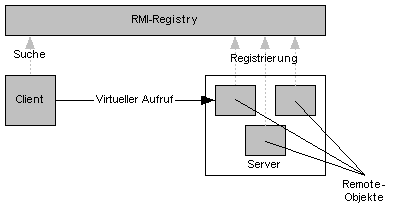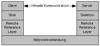 RMI etabliert also eine Client-Server-Architektur zwischen lokalen Java-Objekten und den von ihnen aufgerufenen Remote-Objekten. Die eigentliche Kommunikation zwischen den Teilnehmern ist fast vollständig unsichtbar.